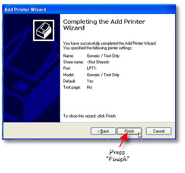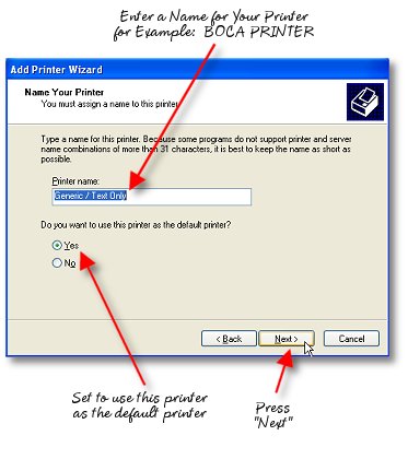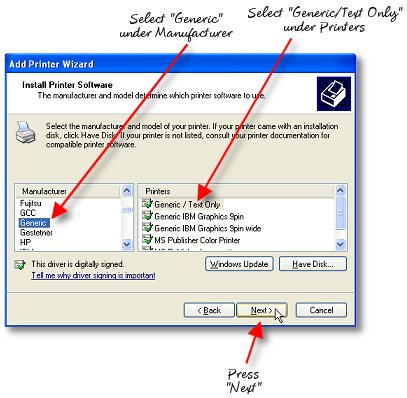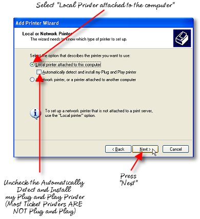 When using the printer you have selected, you just install the appropriate Windows printer drivers for the printer. On the distribution CD-ROM are many of the drivers for the popular reciept printer brands. For the Boca, Practical Automation and Datamax printers and other FGL printers, simply install the "Generic/Text Only" driver included with your Windows Operating System. If you install another driver from the manufacturer of your FGL language printer for one of the other languages supported (such as PCL and Windows True-Type Fonts) there will be a considerably greater time required to print your tickets and the raw FGL codes will be printed on your tickets as well. In order to provide the fastet possible printing, we have opted to use the internal "hardware" fonts rather than the downloadable "software" fonts those drivers will be addressing.... so be certain you install the generic text font rather than any others shipped with your FGL printer.