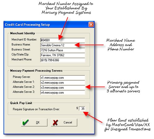 The information from Mercury Payment Systems with regard to your merchant number and payment servers will be entered here. This must be done on every terminal set up to accept credit cards through this merchant account.