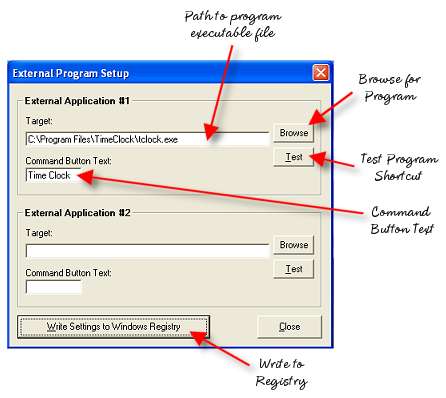 Up to two external programs can be executed from the Terminal Menu via two configurable command buttons. These can be used to execute a time clock program or other external application. The external applications must be set up on each individual terminal as these settings are saved to that computer's Windows Registry.