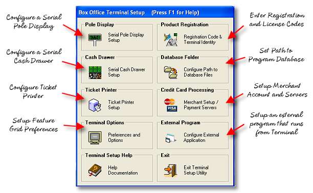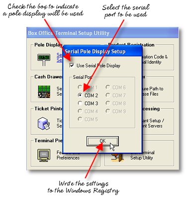 For every terminal installed there will be a Terminal Setup Utility that is used to configure settings for the individual terminal workstation. These settings are stored in the Windows Registry on the workstation rather than in the master program database because these settings for the most part are unique to the particular computer. For the manager's office computer, only the data path and registration information are necessary. Terminal Identity Codes only apply to selling terminals.