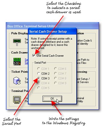 If you are using an Epson or Citizen or some other receipt printer with a recepticle for a cash drawer and have a cash drawer designed to work in conjunction with a printer, this setup does not apply to you. A serial cash drawer is used when no such printer connection exists and the user has a stand-alone cash drawer designed to plug directly into the computer via a serial port.